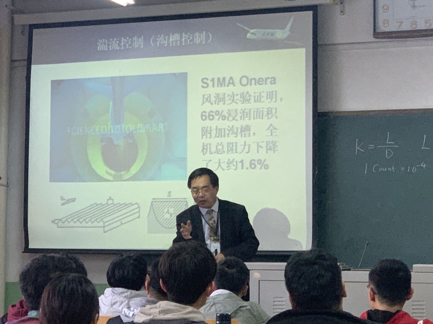 学术报告的主要内容包括空气动力学的发展,增升与减阻技术,流动分离和漩涡和气动动噪声。刘沛清教授通过收集的大量的历史信息,给参会者展现了人类渴望傲游天空的追梦历程。人类通过对鸟的飞行奥妙的认知与实践,制造出的各种飞行器,在尺度、飞行高度、飞行速度、飞行航程、复杂程度等方面,远非鸟所及。这其中,空气动力学起了关键性的作用。随后刘沛清教授又从空气动力学的几个技术方面为师生们进行了更深刻的讲解。