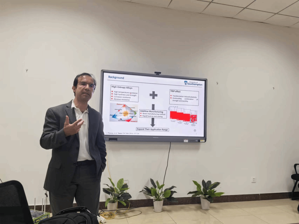 Pedro Rivera教授针对高熵合金特点与高熵合金相形成规律,通过各组元含量的微调控,从而调控该合金系的相关热力学参数,进而提出可以3D打印且具有应力诱导塑性效应的高强钛基高熵合金。该系列合金从室温到高温的力学测试中,呈现出明显的相变诱导塑性效应,并且在在特定温度下表现出孪晶诱导塑性,在高温条件下表现出超塑性。针对该合金的优异性能,Pedro教授也提出该合金未来在航空航天领域的潜在应用。学院师生与Pedro教授热烈讨论,受益良多。