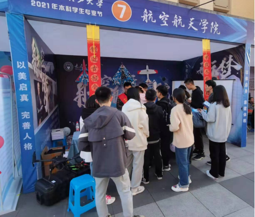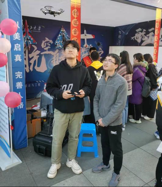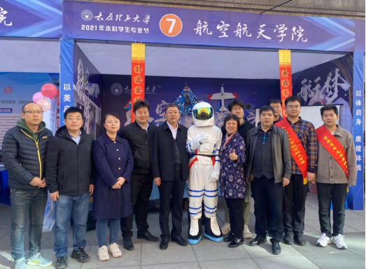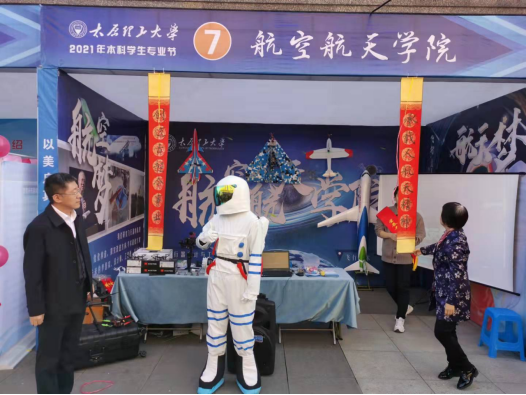 展位背景墙简单大气,“航空梦”和“航天梦”相映其上,三幅图配以简洁文字,明快表达了“飞行器设计与工程”和“飞行技术”两个专业的建设目的、培养目标和发展愿景。背景墙上悬挂着航模协会的飞机模型,这是曾经同学们练手并试飞成功的功勋机型,展示出协会从0到1的蓬勃发展势头。展台上摆放着3D打印的发动机结构模型,吸引“航迷”们竞相猜测型号和搭载机型。小型四旋翼无人机简单方便,下载软件后,人人都可以成为熟练的“飞手”。吸引大家的还有我们的宇航员,手摇国旗招呼大家来展位参观,或合影留念,不时摆出夸张的姿势,流露出“我已出舱,感觉良好”。展架上悬有“传承载人航天精神,开创迈古超今事业”楹联,这是学校和学院跨越式发展的生动写实,也是致力于开创山西高水平教育的豪迈誓言。问答环节伴有抽奖活动,颇具特色的直升飞机饰品、火箭发射玩具和飞机模型胸针引人注目,吸引大家前来一试。“我国有几座航天发射场”,“太原卫星发射基地位于哪里”,“大型客机C919的总设计师是谁”,“前两天我国载人航天工程发射的飞船叫什么名字”等问题既考验常识性知识,也增进了大家对航空航天事业发展的浓厚兴趣。