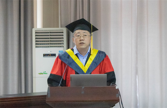 在热烈的掌声中,李文辉教授走上报告台,以“在青春的赛道上勇毅前行”为题向2022届毕业生致辞。李文辉首先向毕业生们致以诚挚的祝贺和美好的祝福,向所有为毕业生的成长付出辛劳的师长、亲人表示衷心的感谢。他说:“作为学院的首届学生,我们一起共同见证了学院的成立、发展,我们也一起经历了世纪疫情的严峻考验。相信在经历过重重困难的考验和磨砺之后,你们应该、也一定能够变得更加成熟、稳重、睿智和坚强,也一定能够取得过人的成绩和非凡的成就。”他对同学们提出:要坚定理想信念,争做时代青年;要坚持平凡执着,提升能力水平;要坚守团结协作,凝聚校友力量,体现出一位师长对青年学子的谆谆教诲和殷切期望。最后,李文辉向全体毕业生送上祝福,祝愿他们在今后的人生道路上披荆斩棘、斗志昂扬,乘风破浪、一往无前,前程似锦、一路生花。