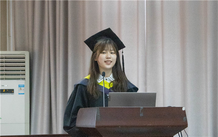毕业生代表、获得直博资格的刘静怡同学激情发言。她回顾了同学们刚入院时怀揣空天梦想,在老师们严格要求下求学的历程。言语间展现出学院秉承“求实、严谨、创新、筑梦”的院训,矢志为国育才的培养目标。两年来,她与同学们一起伴随着学院一点一滴的成长与进步,享受着老师们在学习和生活中对大家的关心与关爱,体验到大家庭的温暖。她表示,今后将继续潜心钻研、砥砺前行,将奋斗作为青春最亮丽的底色,在青春的赛道上,闪耀出自己的最绚丽的荣光。