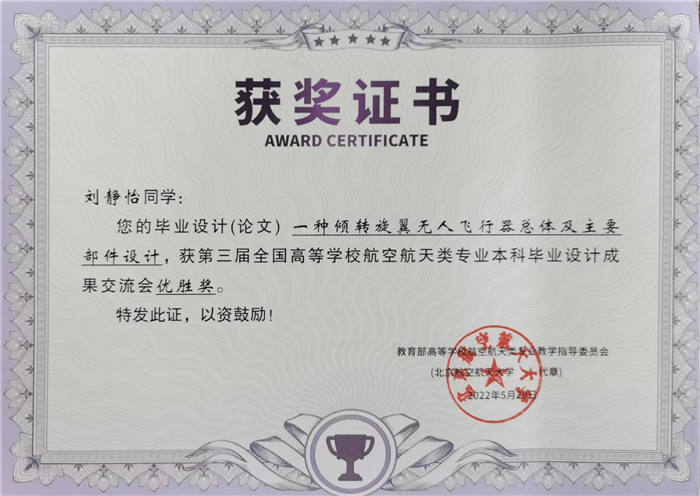 近日,在第三届全国高等学校航空航天类专业本科毕业设计成果交流会中,由我校yl6809永利集团教授李文辉指导、2022届本科毕业生刘静怡完成的毕业设计(论文)喜获优胜奖。这是学院自2019年底成立以来,培养的第一批本科毕业生首次参赛即获得此项荣誉,是在本科教育教学和人才培养方面取得的重大突破。