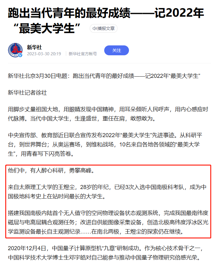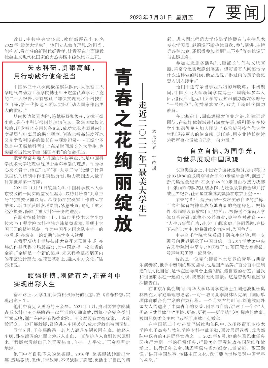 3月31日,我校2019级博士研究生王煜尘作为10名全国“最美大学生”之一亮相由中宣部、教育部和中央广播电视总台联合主办的《闪亮的名字——2022最美大学生/最美高校辅导员发布仪式》他在南极与祖国连线通过央视镜头向全国观众讲述了他参加极地科考、勇攀科研高峰、把论文写在祖国大地上的成长历程。