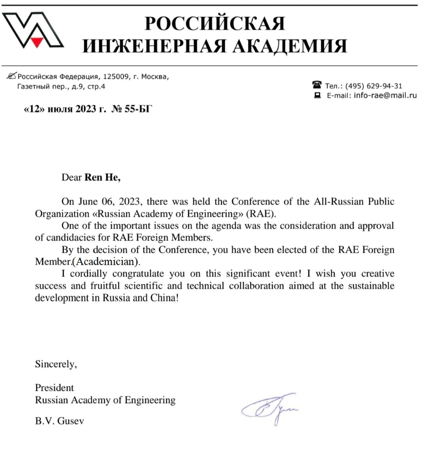 任和教授作为我院特聘客座教授,自聘任以来,始终心系学院建设和发展,在学科布局、学生培养、教师发展等多方面给与帮助,多次通过线上线下方式与学院师生开展学术交流。在此热烈祝贺任和教授当选俄罗斯工程院外籍院士!