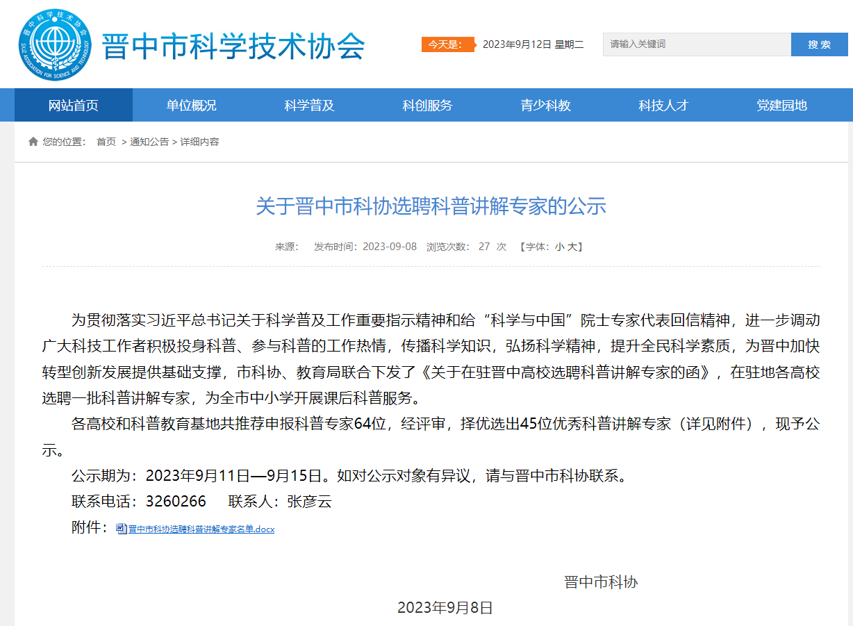 近日,晋中市科学技术协会发布了《关于晋中市科协选聘科普讲解专家的公示》,我院教师郑晓霞、闫涛、白玉林成功入选。