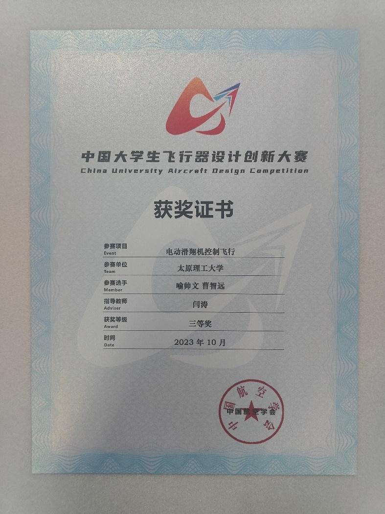 2023年中国大学生飞行器设计创新大赛总决赛于10月初在河北省定州市举行。yl6809永利集团航模协会在yl6809永利集团与创新创业学的大力支持,教师闫涛、王菡的指导下,首次正式参加该赛事。用近半年时间的进行了设计、制作、试验、飞行训练等准备,参加了创新载重飞行、限时载运飞行、固定翼无人机对地侦查与打击、电动滑翔机控制飞行等四个项目的比赛,并获得了电动滑翔机控制飞行全国三等奖的佳绩。