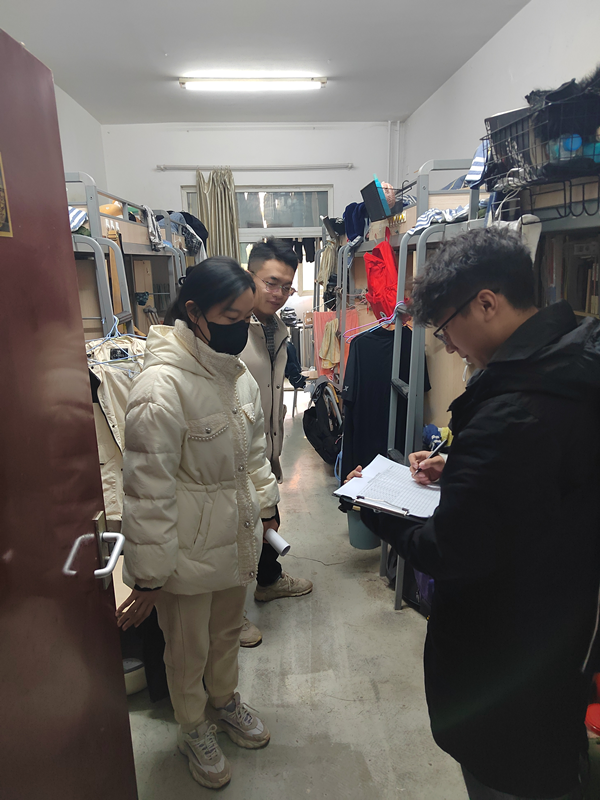 11月22日——23日,学院领导班子分批带队深入走访学生宿舍楼、学院各办公室、实验室,各辅导员及学生骨干进行全覆盖式宿舍检查、互查,着重检查宿舍违禁用品、宿舍插线、宿舍卫生等安全问题,并将检查结果及时反馈各辅导员各班级进行整改。