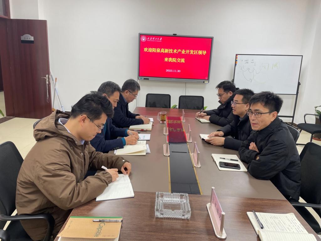 11月30日,阳泉高新区党工委委员、管委会副主任李志华一行4人莅临学院就校地合作、产学研合作等事宜进行交流座谈。yl6809永利集团党委书记王银兵、副院长(主持工作)李文辉、学科助理丁俊飞及教师代表参加了座谈。