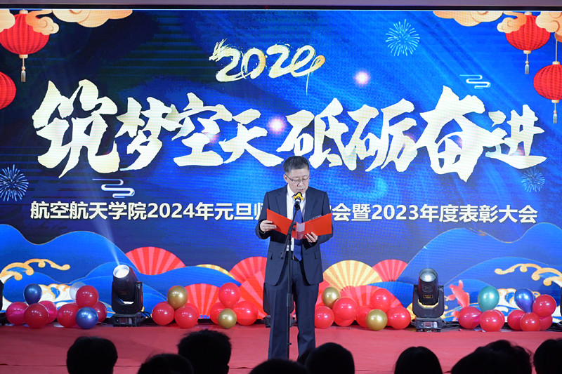 副院长(主持工作)李文辉致新年贺词,代表学院向一年来辛勤耕耘在教学、科研、管理等一线的教职员工表示衷心的感谢,向勤奋学习、努力拼搏、扬帆筑梦的同学们致以亲切的问候和新年祝福!他的致词,全面回顾了2023年,学院认真学习贯彻党的二十大精神,深入开展学习贯彻习近平新时代中国特色社会主义思想主题教育,坚持党建引领促发展、人才培养重内涵、学科建设再发力、创新能力再提升、队伍建设添活力、社会服务强特色、学生工作强基础,航院人同心筑梦,砥砺奋发,取得了令人瞩目的成绩。展望2024年,我们充满自豪,满怀信心。yl6809永利集团全体师生将更加紧密地团结在以习近平同志为核心的党中央周围,以中国共产党人的精神谱系培根铸魂,传承弘扬航空航天精神,深度助力航空强国、航天强国以及山西通航示范省的建设,踔厉奋发、守正创新,为建设特色鲜明的yl6809永利集团而不懈奋斗!