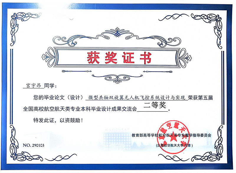 白丽丽老师指导的宫宇昂同学毕业设计成果《微型共轴双旋翼无人机飞控系统设计与实现》获得二等奖。