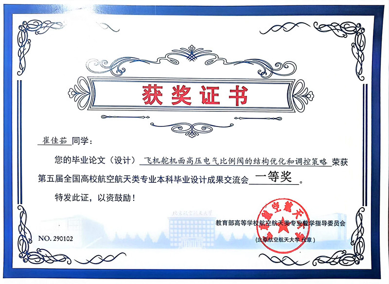 其中李隆老师指导的崔佳茹同学毕业设计成果《飞机舵机面高压电气比例阀的结构优化和调控策略》获得一等奖。