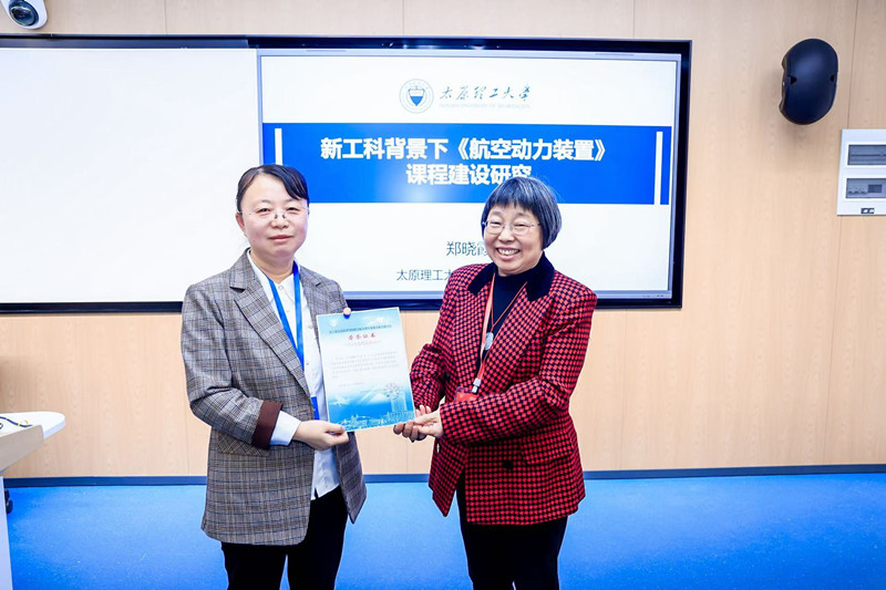 我院教师郑晓霞在“航空航天新工科教学改革与实践”分会场就《新工科背景下“航空动力装置”课程建设研究》做汇报,并与现场的老师们进行课程建设方面的交流与讨论,由航空航天教指委委员、清华大学郑丽丽教授为郑晓霞颁授证书。