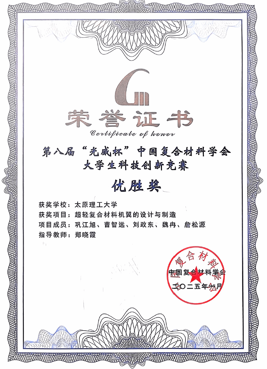 2025年1月3日-4日,第八届“光威杯”中国复合材料学会大学生科技创新竞赛决赛在哈尔滨圆满举办。在郑晓霞老师和研究生何博涵、杨桥的指导下,我院学生巩江旭代表团队成员曹智远、刘政东、魏冉、詹松源参加了现场答辩,展示了团队作品《超轻复合材料机翼的设计与制造》的研究过程和方法以及所获成果,最终在决赛中获得优胜奖。
