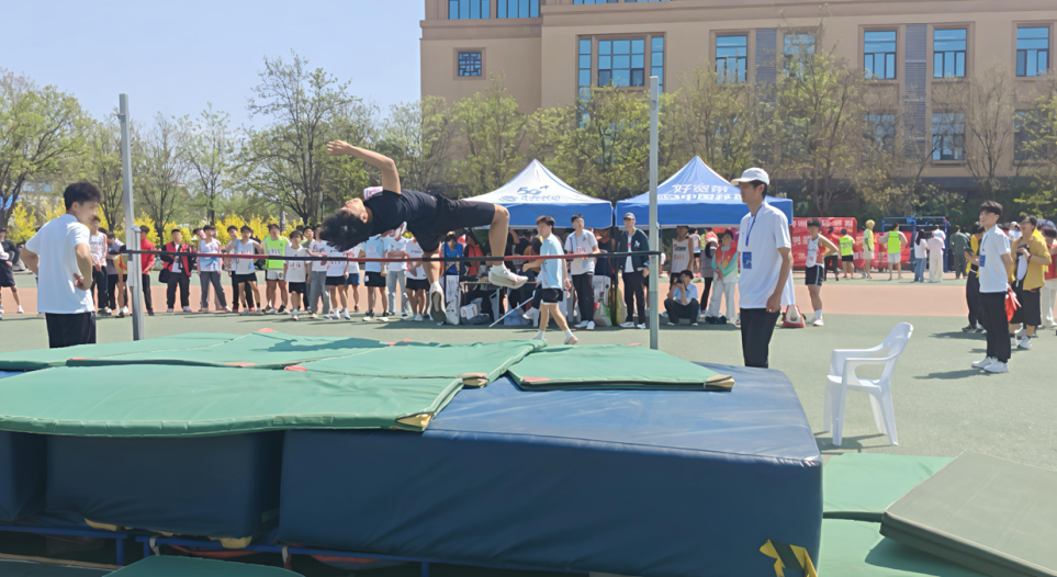 跳高比赛中,飞设2202班王浩楠同学纵身一跳,身形如展翅鸿鹄凌空腾跃,在空中划出一道美丽的弧线,获得甲组男子跳高第六名的好成绩。