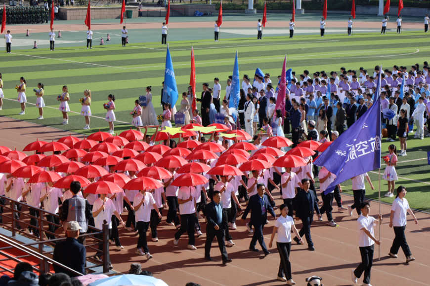 学院方阵以一抹炽烈的“中国红”震撼登场。晴空之下,一把把红伞似花瓣绽放,在青春的律动中汇聚成一幅流动的五星红旗,将航空航天人的报国赤忱与春日蓬勃生机完美融合。“逐梦空天,使命在肩”是他们的理想追求;“强国有我,青春向前”是他们的铮铮誓言。
