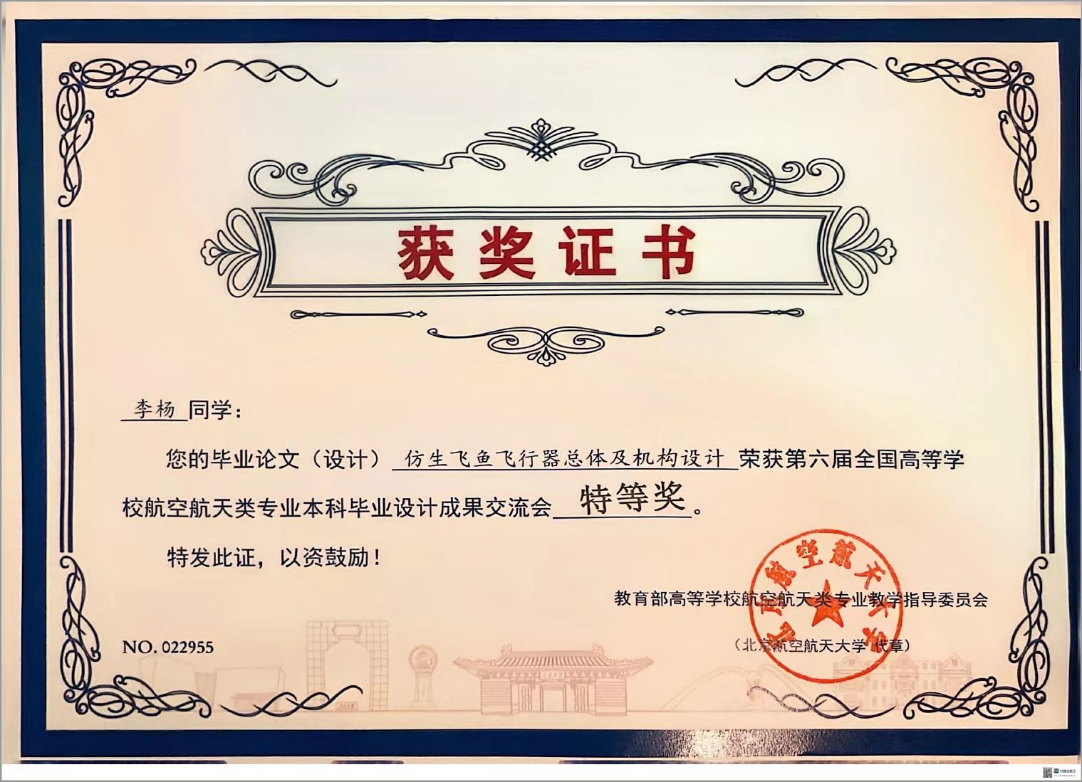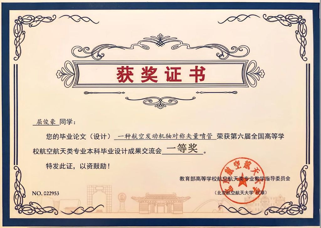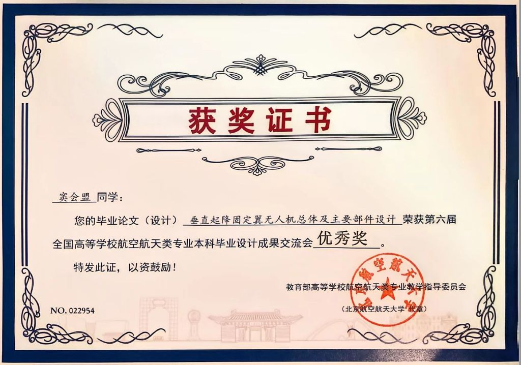 我院21级飞行器设计与工程专业推选了3项毕业设计成果参会,其中,丁俊飞老师指导的李杨同学毕业设计成果《仿生飞鱼飞行器总体设计及机构设计》荣获特等奖;郑晓霞老师指导的屈俊豪同学毕业设计成果《一种航空发动机轴对称矢量喷管》荣获一等奖;高姣姣老师指导的窦会盟同学毕业设计成果《垂直起降固定翼无人机总体及主要部件设计》荣获优秀奖。