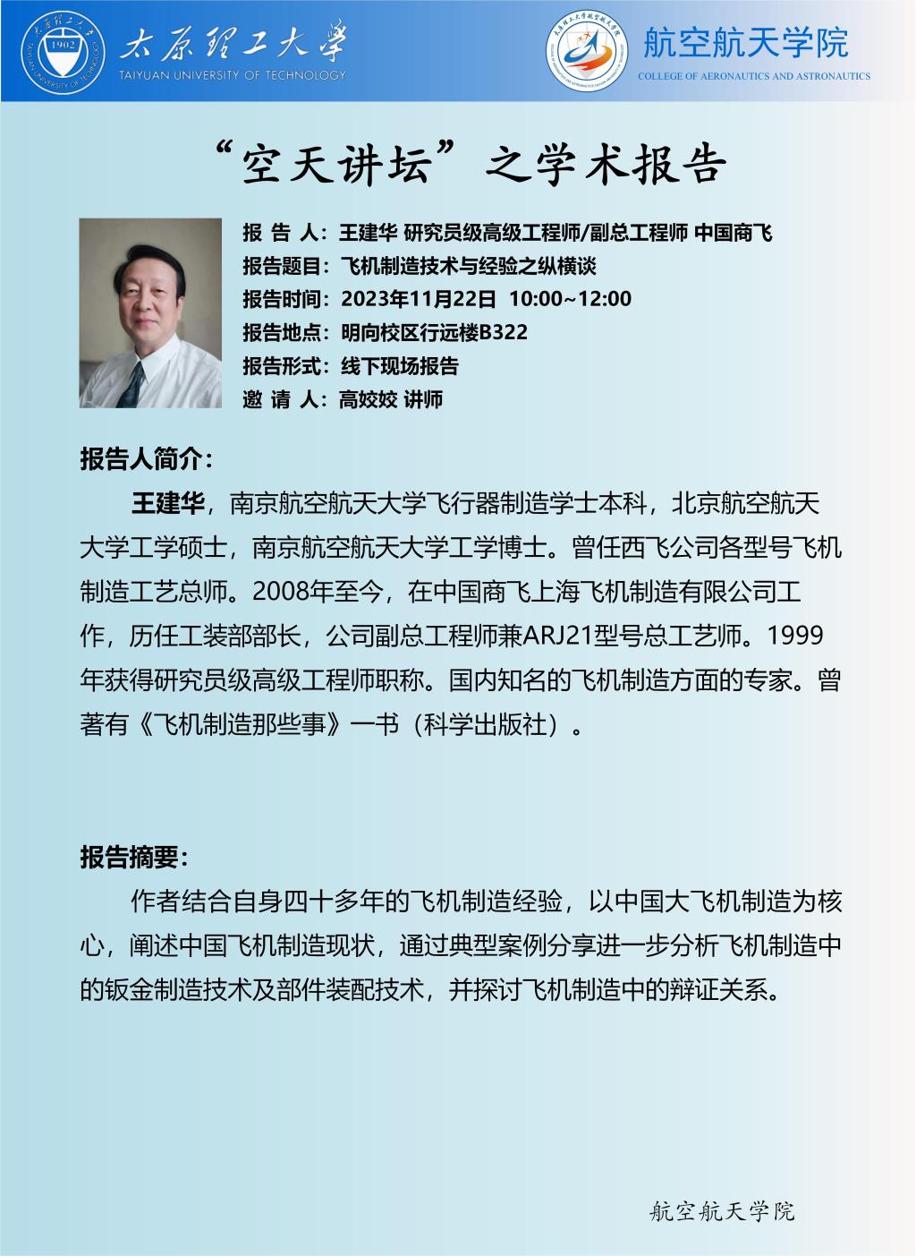 报告题目:飞机制造技术与经验之纵横谈