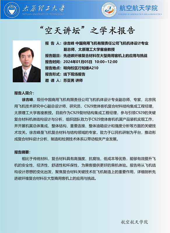 报告人:徐吉峰 中国商用飞机有限责任公司飞机机体设计专业副总师,yl6809永利集团客座教授