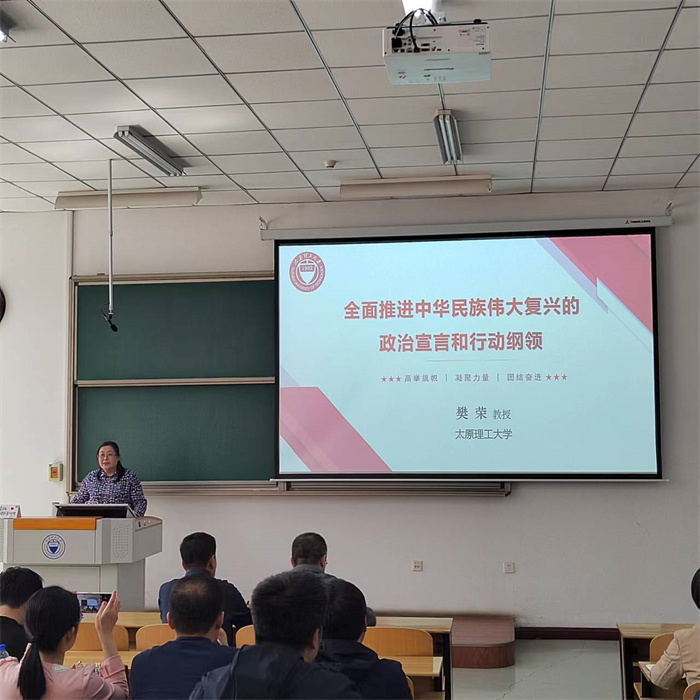 樊荣教授的报告主题鲜明、视野开阔,结合党的百年发展历程和习近平新时代中国特色社会主义思想,深入浅出,分析透彻,既从历史维度讲道理、谈规律,又从实践维度寻初心、溯本源,具有很强的政治性、理论性和指导性,对大家理解掌握党的二十大精神、更好履行新时代职责使命具有重要的促进作用。通过学习,师生党员、发展对象和积极分子对党的二十大报告内容及精神有了更加深刻的理解,将更加坚定、更加紧密地团结在以习近平同志为核心的党中央周围,自信自强、守正创新,踔厉奋发、勇毅前行。