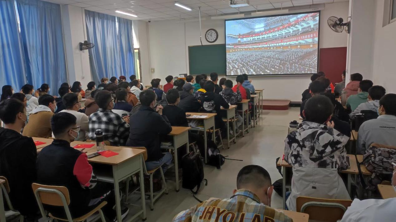 习近平总书记代表第十九届中央委员会向大会做了“高举中国特色社会主义伟大旗帜,全面贯彻习近平新时代中国特色社会主义思想,弘扬伟大建党精神,自信自强、守正创新,踔厉奋发、勇毅前行,为全面建设社会主义现代化国家、全面推进中华民族伟大复兴而团结奋斗”的报告。整个过程中,同学们手持国旗,佩戴党员党徽、团徽,认真聆听,并不时报以热烈的掌声。