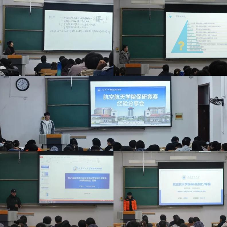 本次分享会邀请了学院2021级飞行器设计与工程专业、工程力学专业推免保研的同学们,他们分别推免至北京航空航天大学、西北工业大学、中国科学院大学、大连理工大学、天津大学、重庆大学等高校。分享会上,几位同学分别从学习方法、时间管理、心态调整、保研申请、参加夏令营、学科竞赛及科研等方面进行了深入浅出的讲解,并且从政策入手,结合自己的亲身经历,从专业学习、能力提升以及保研的资格条件、择校的心路历程、面试的注意事项等方面与同学们进行了深度交流,为在座的同学们提供了宝贵的经验和建议。