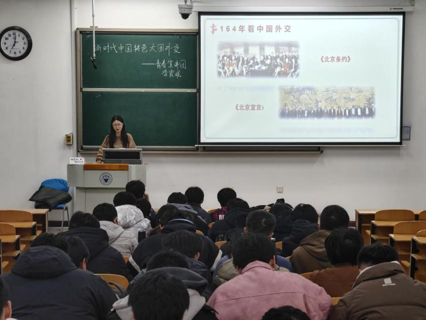 “青马”青春宣讲团成员李霞妮围绕中国特色大国外交在新时代的独特意义、新时代中国特色大国外交的理念基础、外交成就与面临的挑战、新时代中国特色外交未来展望四个方面展开宣讲。李霞妮通过1860年《北京条约》与2024年《关于结束分裂加强巴勒斯坦民族团结的北京宣言》的对比,呈现了164年来中国外交的变化和中国的崛起。进入新时代,中国推动构建相互尊重、公平正义、合作共赢的新型国际关系,持续建设覆盖全球的伙伴关系网络,“对话而不对抗、结伴而不结盟”的中国特色大国外交新实践。