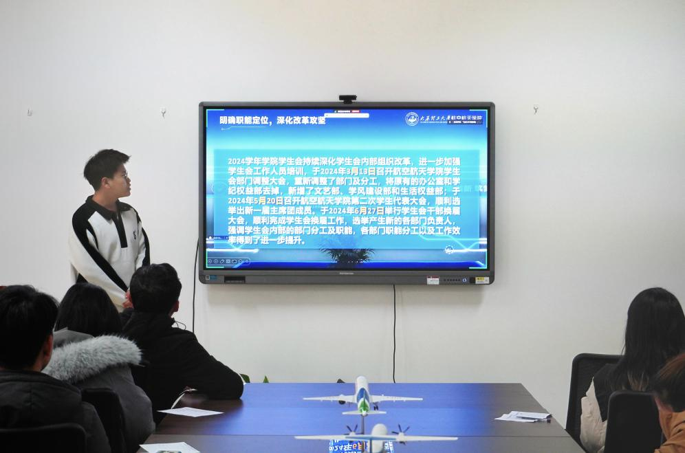 院团委、学生会、科协、融媒体负责人围绕工作回顾、亮点经验、工作展望等方面进行述职汇报,分析工作存在的不足和改进方法,并表示将进一步加强组织自身建设,提高工作效率和工作质量。