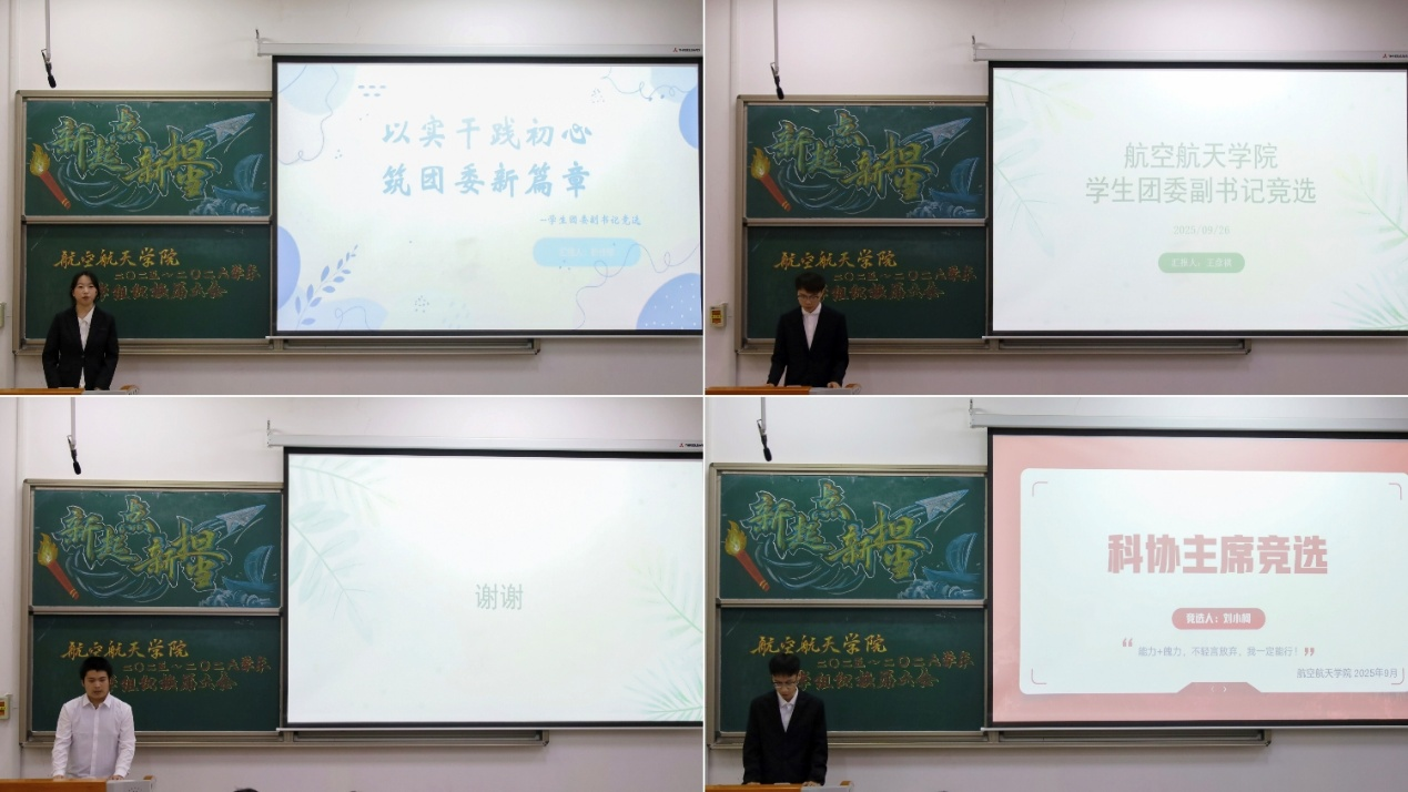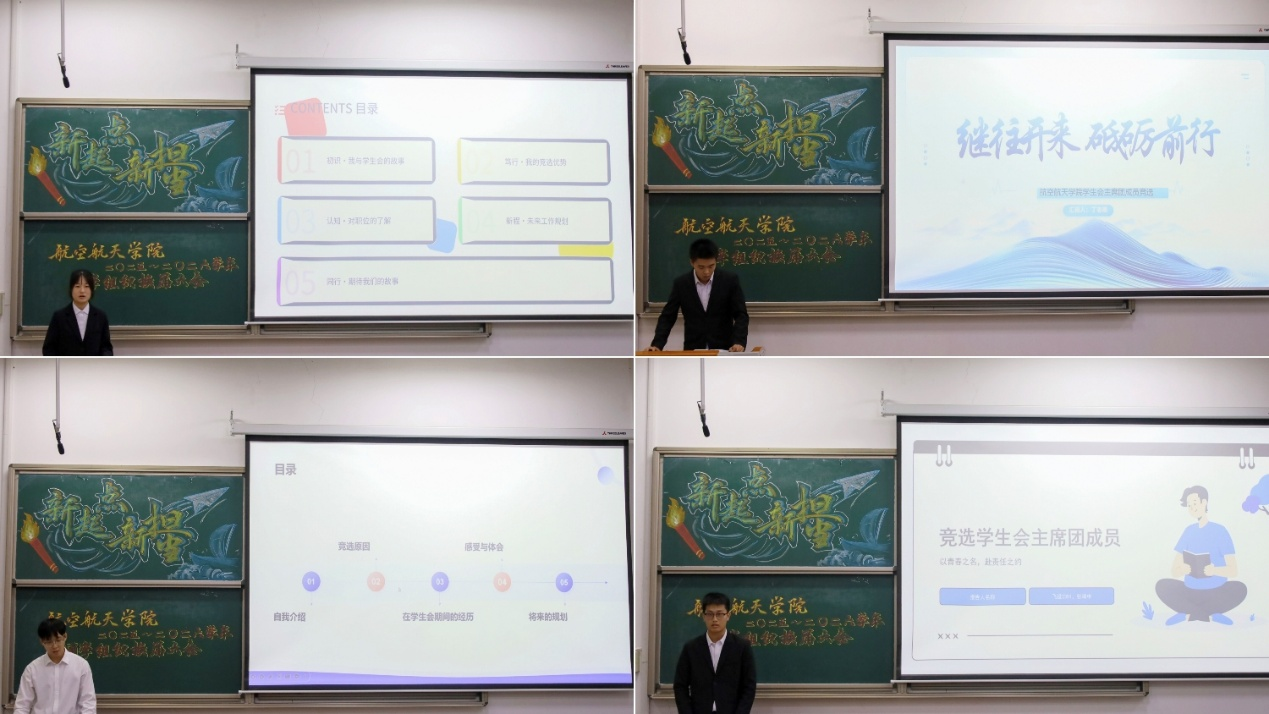 新一届团学组织主要学生干部候选人逐次竞选,阐述了个人竞选优势和对未来工作的规划构想。靳佳郁围绕“敢于担当、积极主动、不负信任”三大承诺,表示将以饱满热情和务实作风履行团委副书记职责,当好党的忠实助手。王彦祺基于其团委办公室工作经验,提出以“强思想、固基础、创特色”为核心,从优化机制、夯实支部、打造品牌活动等方面系统规划未来工作。张哲戬强调了作为学生干部的高效执行与沟通协调能力,并承诺将着力简化工作流程,提升团队效能。刘小柯则聚焦于科技创新,提出要搭建创新实践平台,强化学科竞赛服务,并优化内部培养机制,让成员在科协获得归属感与成长。丁志扬以“继往开来,砥砺前行”为主题,强调学生会工作的核心是“服务与连接”,提出将通过建立定期反馈机制、开展小而美的文化活动,让服务精神真正滴灌到同学心坎里。陈婉茹从自身在学生会中获得的归属感出发,提出要建立“需求导向型”学生会,通过分层级专项服务和品牌活动创新,精准满足同学需求。李明远系统阐述了对主席团职责的理解,强调其桥梁作用,并提出了完善内部管理、拓展品牌活动、加强对外交流等具体规划。张鸣中则结合多次社会实践经历,提出“短期融入调研、中期优化创新、长期机制建设”的三阶段工作规划,致力于让学生会更高效、更贴心。